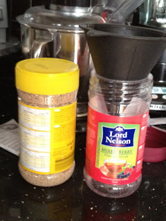 | Lemon granules in a full jar showing where we started and powdered berry tea granules which now fill four fifths of the jar showing how we ended up. Powdered! |